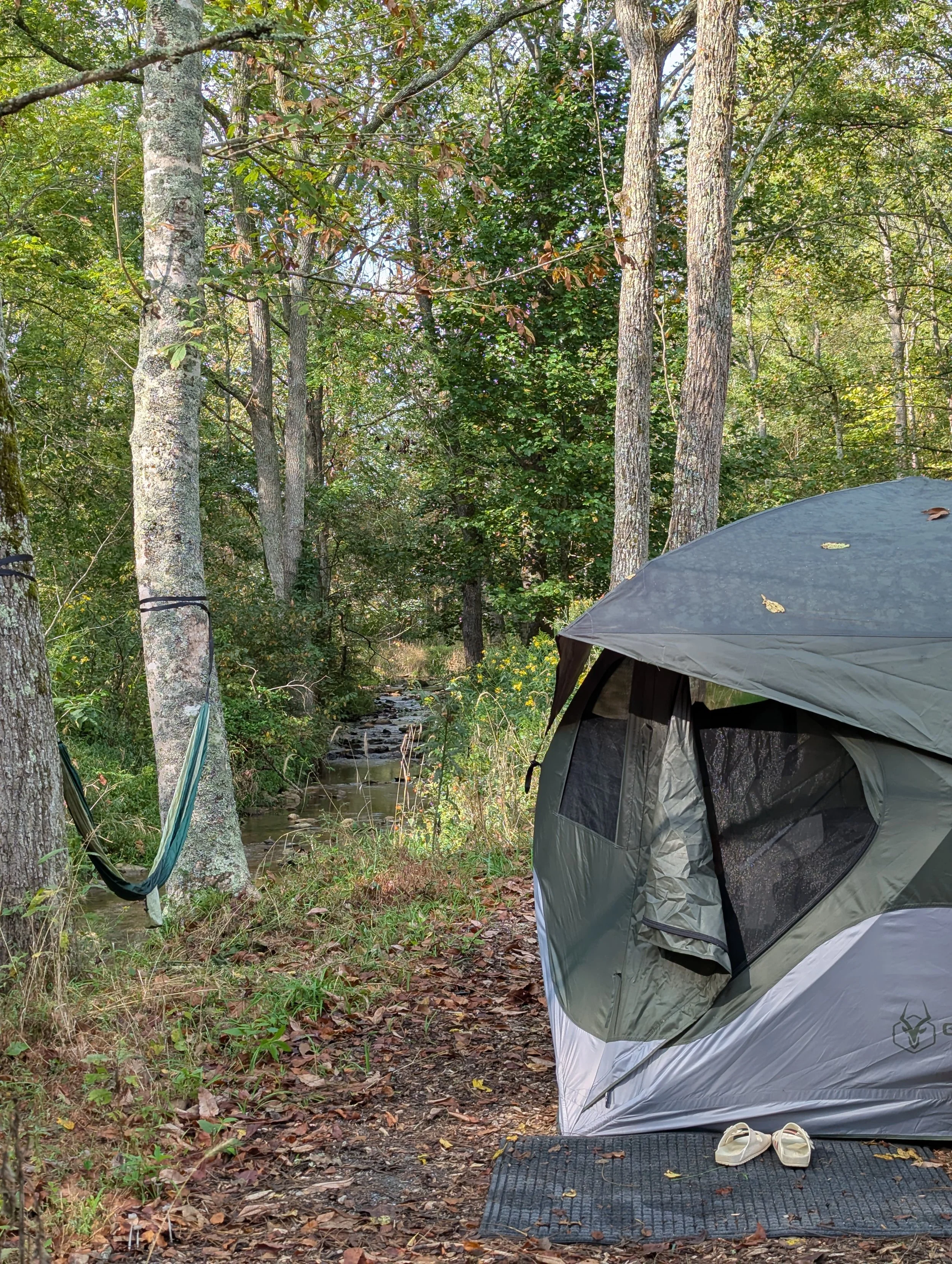 We have 12, 10x10 pop-up tents that blend nicely into the natural surroundings to keep our footprint low-impact and allow ourselves to be enveloped by nature. Each tent is equipped with a waterproof rain fly, an outdoor mat to wipe off dirt, a camping chair for inside or around the property, a raised full-size box spring and 3” foam air mattress, air pump, sleeping bag, crate side table and 2 lanterns. All you need is your clothes and pillow to sleep next to moving waters and wake up to the sounds of birds and leaves, not traffic or the outside world.